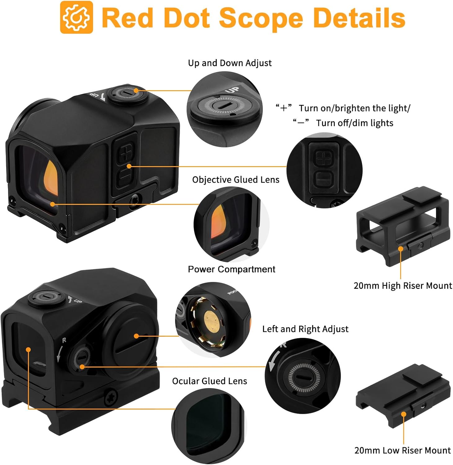 | Included Components | 1x red dot sight, 2x 20mm Picatinny mounts, 1x Hex wrench, 1x adjustment key, 1x lens cloth, 1x user manual, 1x packing box |