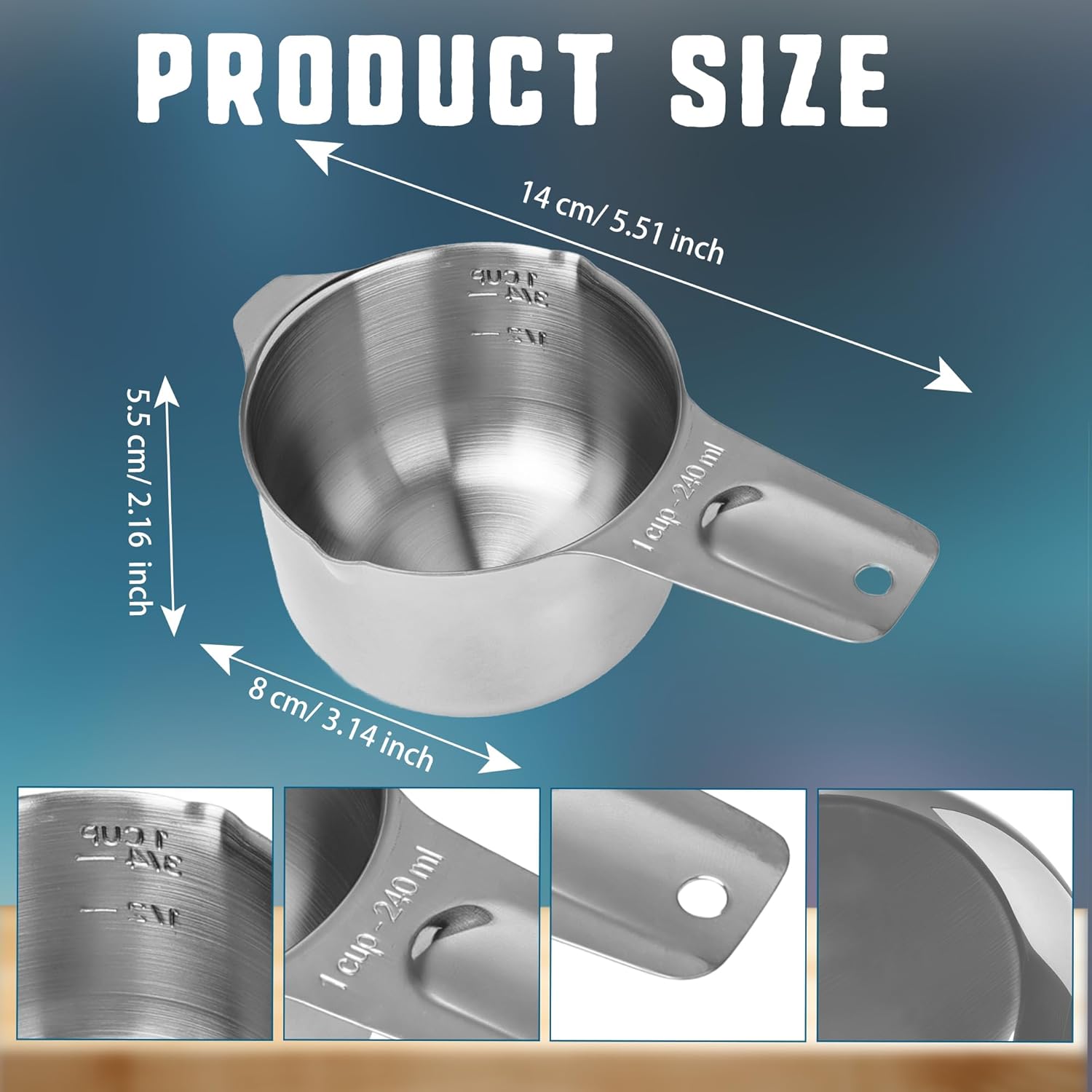 ✅1 Cup Stainless Steel Measuring Cup Product Details: Material: Stainless Steel Size: 2.2 inch/ 5.5 cm high, 3.15 inch/ 8 cm in base diameter, and 5.5 inch/ 14 cm in total length Color: Silver Quantity: 8 pieces ✅8 oz Measuring Cup Special Feature: Our metal measuring cup is designed with convenience in mind: a precision pour spout prevents dripping along the wall, while the flat handle features an inner curve that fits your fingers perfectly for a steady grip. The hanging hole allows for effortless storage, keeping your kitchen neat and organized ✅Packaging: 8 Pcs Metal Measuring Cup