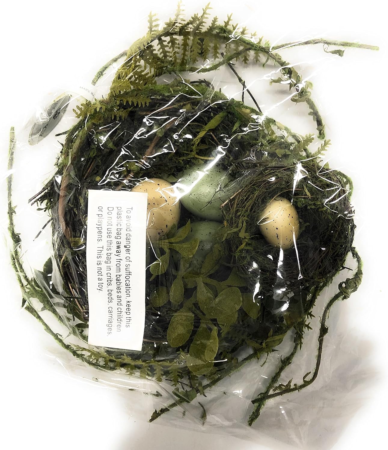 This Decorative Bird Nest Includes a Large 5.25" Nest with three Eggs, 2 Speckled Blue and 1 Speckled Cream Colored . The Large Nest is Decorated all Around with Vines, Twigs and Fern Leaves. Attached to the Large Nest is a Small 2" Nest with a Small Speckled Cream Colored Egg. Both Nests are Made of Green and Brown Twigs. The Large Nest is 2.5" Tall and the Smaller is 1.5" Tall. This Very Well Made and the Ferns and Twigs can be Expanded up to 12". This will go with All Seasons Decor making it a Wonderful Gift.
