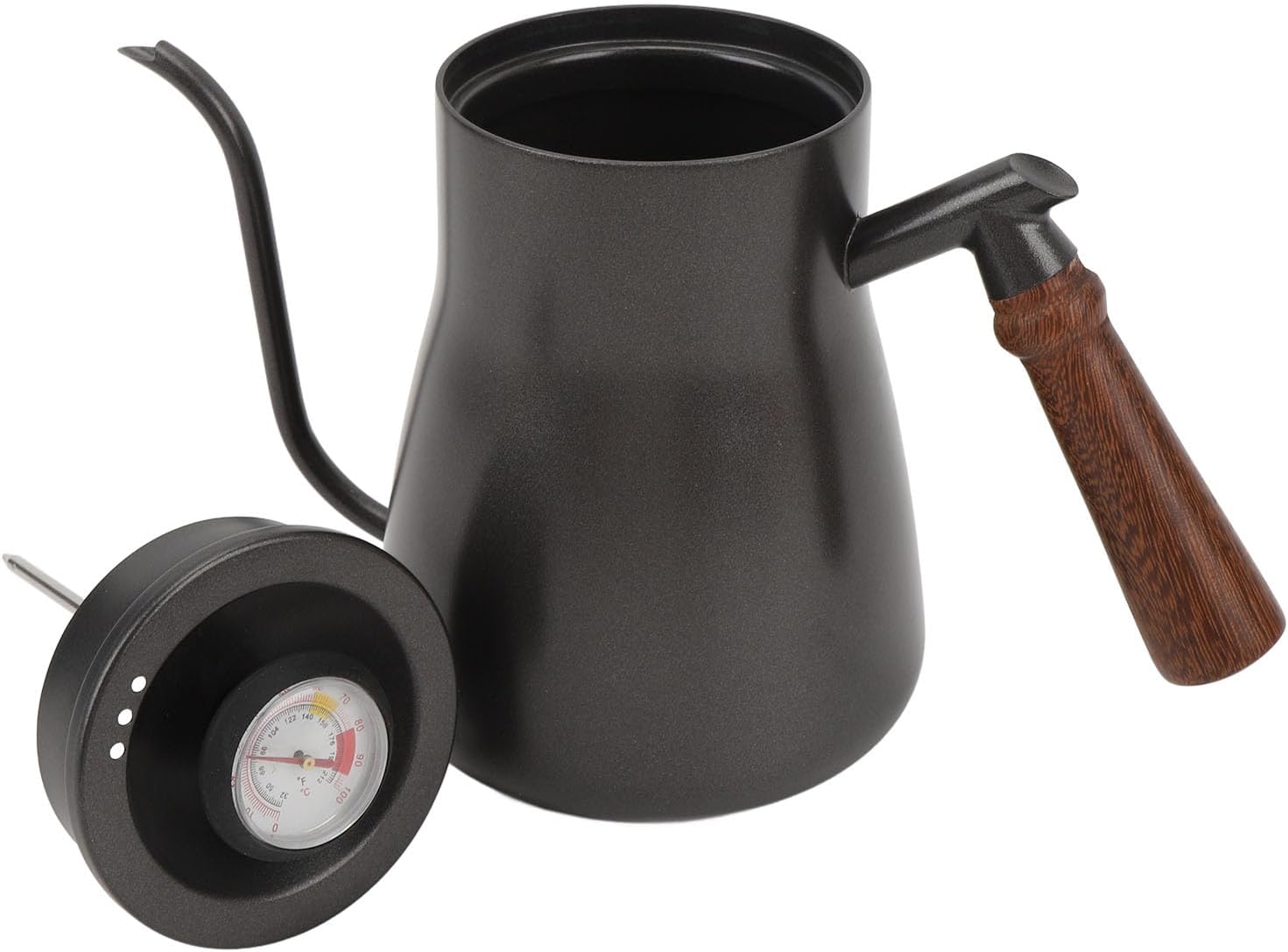 1. Large Capacity: The hand brew coffee pot has a capacity of 850ml, which meets your need to brew multiple cups of coffee at once, without the need to fill water frequently, which is very time saving. Let you enjoy delicious coffee easily and make coffee time more convenient. 2. Material: The coffee maker is made of stainless steel, which is wear , heat , with lasting service life and excellent heat preservation, while the wooden handle design not only provides a greater grip, but also protects you from thermal damage during the brewing process. 3. Temperature Control: The included thermometer can help you accurately control the brewing temperature to ensure the flavour and consistency of the coffee, which not only ensures the flavour and consistency of the coffee, but also meets your of professional barista standards. 4. Slim Spout Design: The specially designed slim spout makes the water flowing more smoothly and easy to control, so that you can simply and quickly control the amount of water when brewing coffee and make the coffee extraction more evenly. 5. Wide Range of Uses: The teapot can be applied in daily life scenarios such as home and office, but also suitable for outdoor travelling and other activities, suitable for all types of hand brewed coffee tools, so that you can enjoy freshly brewed coffee anytime, anywhere. Spec: Item Type: Teakettles with Thermometer Capacity: 850ml Material: Alloy, composite wood, stainless steel Kettle Size: Approx. 13.5 x 24cm / 5.3 x 9.4in PackageList: 1 x Pour Over Kettle