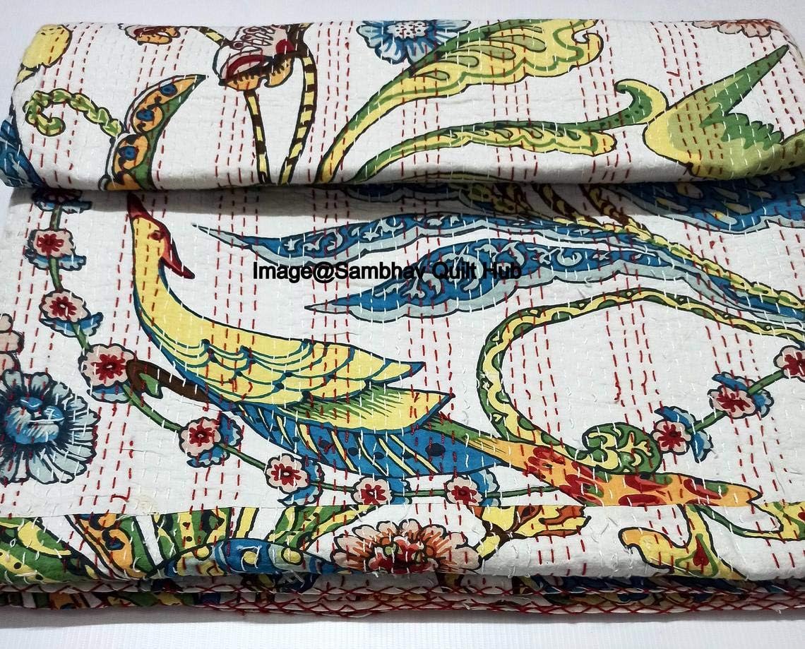 Handmade bird Peacock Kantha Quilt Completely unique & one-off, Beautiful Peacock Print bedspread with the hand-one running "Kantha" stitch. An Attractive and Traditional bed spread is an ideal for different modern and traditional decor. It is Stitched by thousands of "Tiny Stitches" all over the fabric by local artisans of the Thar desert region in India. Hand stitched in the Kantha style to create a stunning texture and appearance. One-of-a-kind designs emerge from afternoons shared between village women while adding lines of "running stitch" to these masterpieces. Right blend of all that you are looking for - comfort, beauty, durability and affordability. Fine quality cotton fabric make this bedspread durable and comfortable. This bed spread will definitely capture the heart. Give a elegant look to your room through this Traditional Beautiful design Handmade Twin/King / California Size Bedspread.