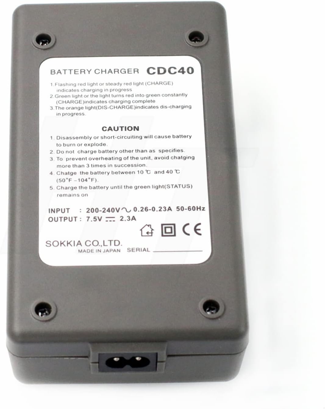 Features 1. Charger CDC40 for Sokkia BDC35 BDC35A Battery. 2. A country specific AC power cord is included with the charger. 3. The charger has a trickle charge feature. This ensures that the battery is always fully charged and ready for use. 4. Works and charges the same as the original. 5. Comes with 12 months manufacturer warranty. 6. Safety, CE, RoHS approval.