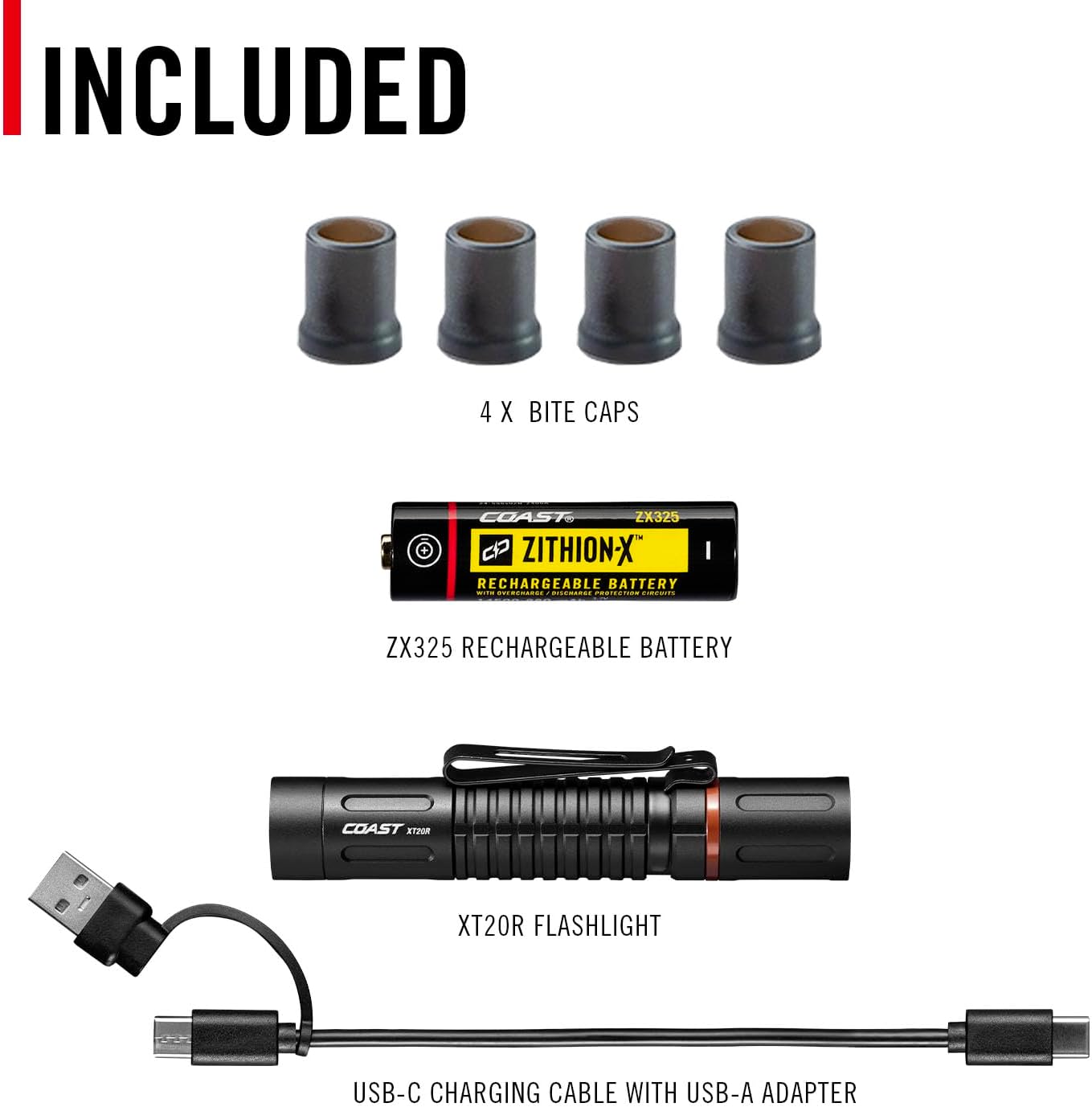 Brighter work is lighter work. Keep the XT20R rechargeable EDC flashlight with you at all times for powerful, packable illumination—whether in the auto shop or out on a job site. Peaking at 520 lumens, this four-mode flashlight—medium, high, low, and MoonGlow—provides the light you need without any fuss. Adjust the beam to your need using the PURE BEAM optic with TWIST FOCUS, seamlessly transitioning between Ultra View Flood Beam and BULLS-EYE Spot Beam. At just over 8 cm long, the XT20R carries easily in a pants pocket or in your tool bag, secured by a two-way pocket clip that also doubles as a hands-free mount for the bill of a hat. Need to hold your light in your mouth? No problem—we designed a durable rubber bite cap that snugs onto the end of the light and protects your teeth during use. Powered by the COAST Rechargeable Plus system, this flashlight delivers long run times from its included rechargeable ZITHION battery or one AA alkaline battery (purchased separately). Recharge the ZITHION battery via the flashlight’s built-in USB-C port. Constructed of top-grade materials, the XT20R is rated IP54 water-resistant and dust-resistant and backed by the COAST lifetime warranty.