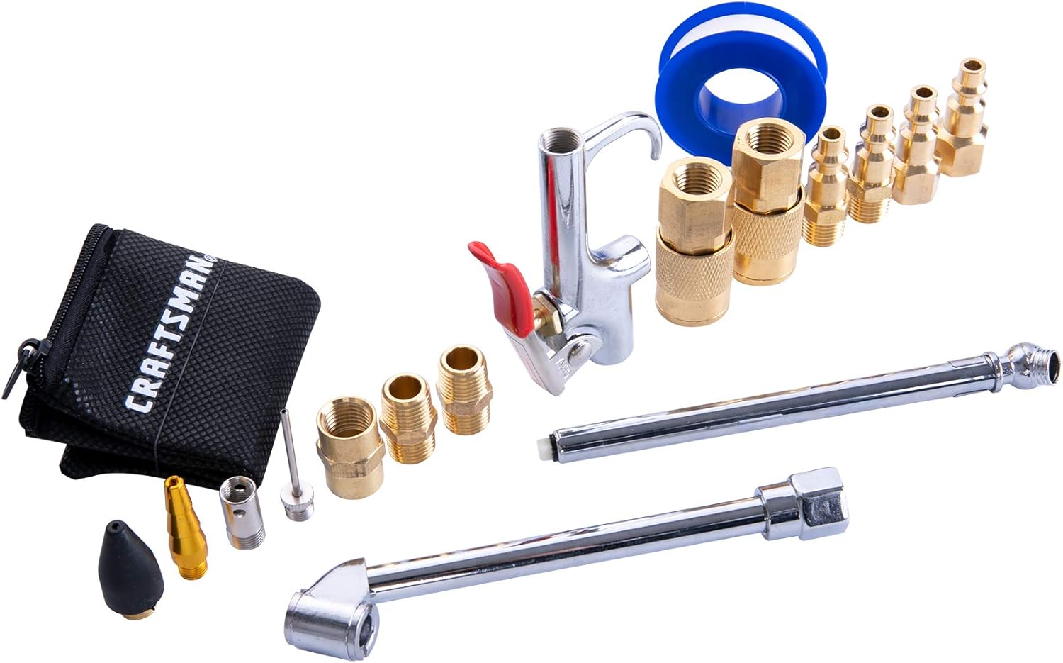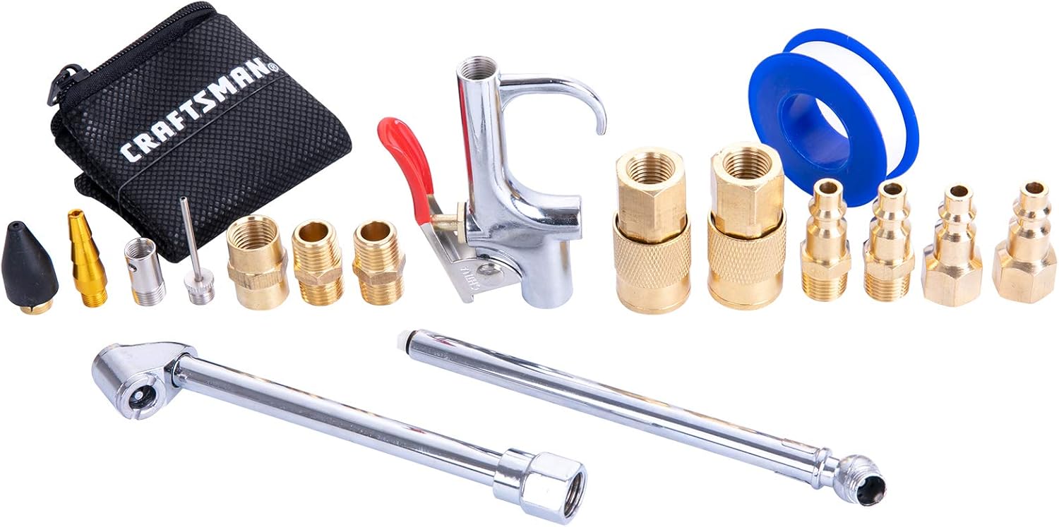 CRAFTSMAN Air Compressor, 20 Gallon, 1.8 HP, Oil-Free Air Tools, Max 175 PSI Pressure, 2 Quick Coupler, Long Lifecycle Low Noise, Model: CMXECXA0232043, RedCraftsman is a line of tools, lawn and garden equipment, and work wear, product is sold since 1927. Craftsman continues to provide the high quality products and service to global customers. The Craftsman CMXECXA0232043 oil-free air compressor is designed to be one of the most powerful air compressors in the related industry. Its huge capacity of 20 gallon and convenient use with 2× 8'' rubber wheels and rubber reinforce handle allow for a variety of applications. It features an 1. 8 HP UMC motor that provides long life and optimum performance. With an oil-free, maintenance-free pump designed for durability, every Craftsman compressor is ready for a long life. Key Spec: Tank Size: 20 Gallon Peak Horsepower: 1. 8 HP Working Pressure: 145-175 PSI (Max 175 PSI) CFM @ 40 PSI: 5 CFM @ 90 PSI: 4 Power Supply: Electric Cord Length: 6 feet Coupler Size: 1/4 NPT Number of Couplers: 2 Packing Size: 21. 65 x 18. 31 x 41. 73 inches Warranty:1 year limitedCraftsman 18-pc. Air Accessory Kit (CMXZTSG1004NB)A high-quality accessory kit gets you started with all the basic essentials. This 18-piece kit covers inflating and checking pressure on tires, inflating sports balls, blowing off surfaces and adapting/connecting multiple tools. Teflon tap is provided for all your fittings to prevent leaking. The soft storage case will keep your kit organized.