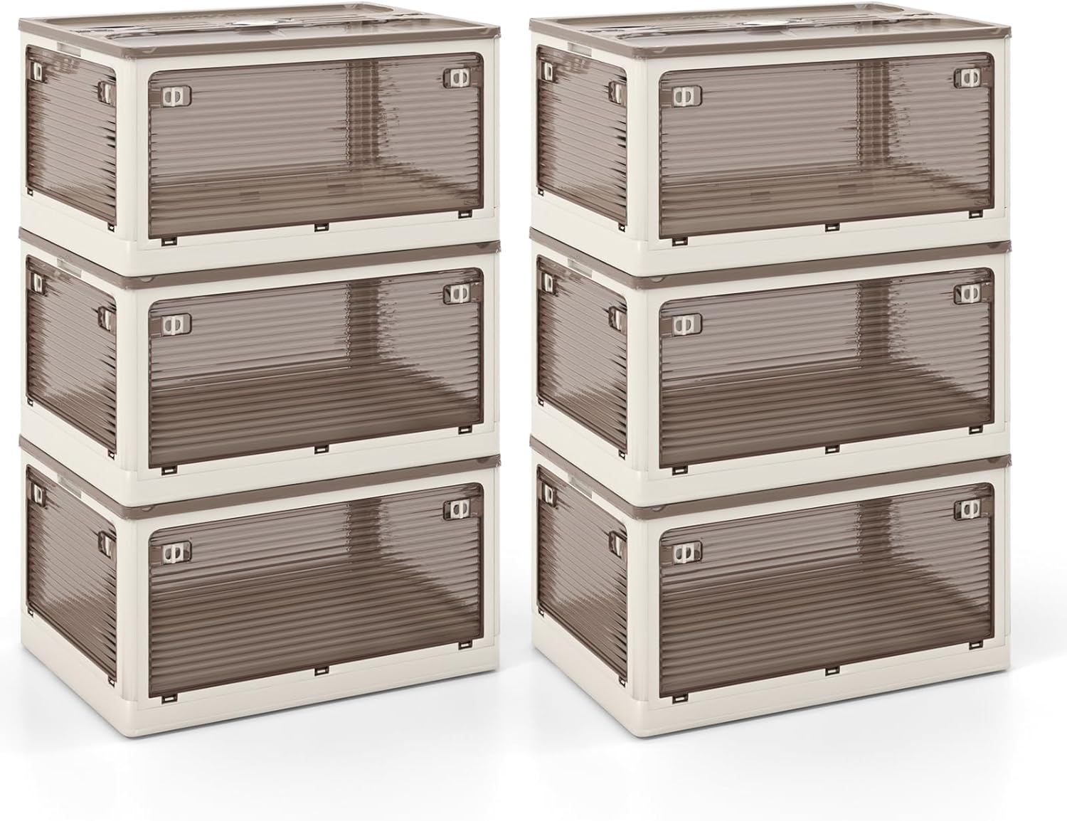 Description:Discover the perfect home organization solution! This 3-pack storage bin set is a game-changer, offering a whopping 34.5 gallon capacity totally! Perfect for stashing everything from winter wear to sports gear, it simplifies organization with 5 convenient access points, including a smart desiccant compartment to keep contents fresh. No tools? No problem! Set up is a breeze with our foldable, ready-to-go design. Moreover, you can stack them up or spread them out as you like! Plus, moving them around is smooth and effortless with built-in wheels and handles. Click now to transform clutter into a tidy haven with our versatile storage bins! Features:Large capacity for clothing, snacks, books and even shoes 5 opening ways offer easy access to the items inside Tool-free assembly saves you time and effort Collapsible bins can be folded when not in use Stackable design allows you to combine the boxes as needed Desiccant compartments help to keep the interior space fresh Equipped with handles and smooth wheels for easy movement User-friendly design of translucent doors for more convenience Perfect addition to your living room, kitchen, bedroom or laundry room Specifications:Color: Cream White + Clear Brown Material: PP, HIPS Dimensions of Each Bin: 20” x 14.5” x 12” (L x W x H) Height of 3 Stacked Bins: 34.5” Dimensions of Folded Bin: 20” x 14.5” x 3” (L x W x H) Dimensions of Front Door: 17.5” x 8” (L x W) Capacity of Each Bin: 46 QT (11.5 Gal) Total Capacity: 138 QT (34.5 Gal) Load Capacity: 165 lbs Net Weight: 12.5 lbs Package Includes: 3 x Storage Bins 1 x User’s Manual