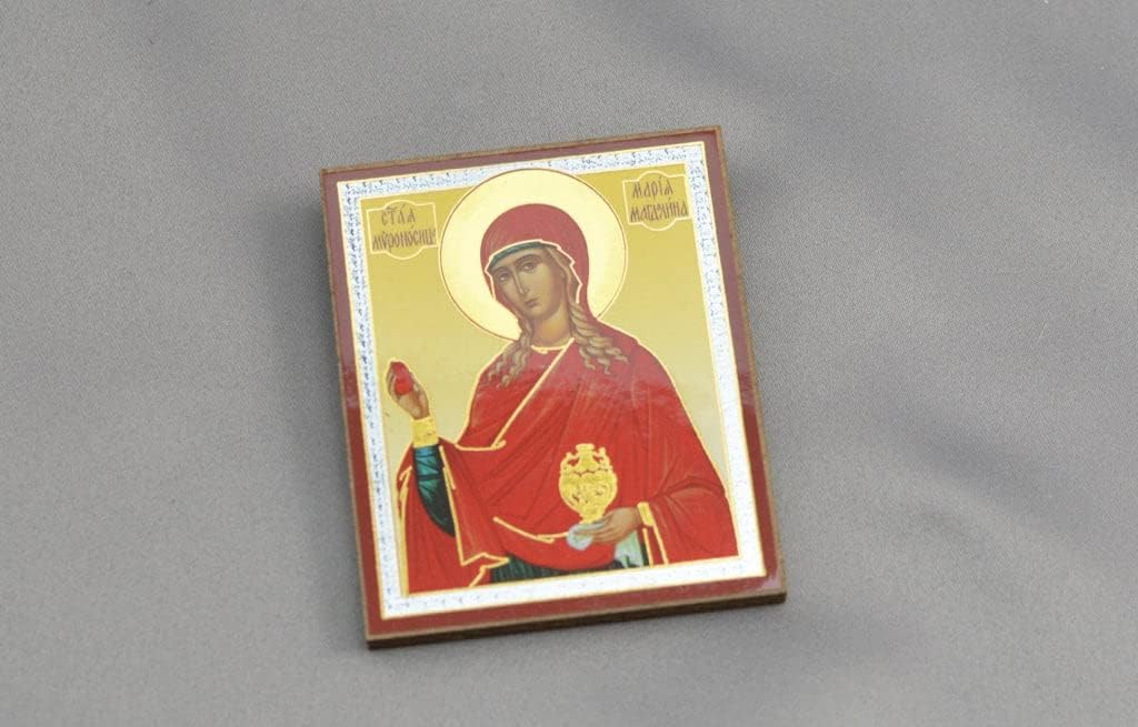 Celebrate a girl's participation as myrrhophora this year with this Easter candle celebrating Mary Magdalene as Myrrh-Bearer. The candles are decorated with red burlap and accented with a small keepsake icon of St. Mary Magdalene holding a red egg or the Myrrh Bearers icon. Icons measure 2 1/2" x 3". Each hand dipped, taper candle is 17" long by 3/4" in diameter. The candle arrives to your godchild gift wrapped in cellophane and a Happy Easter/Καλἠ Ανἀσταση tag.