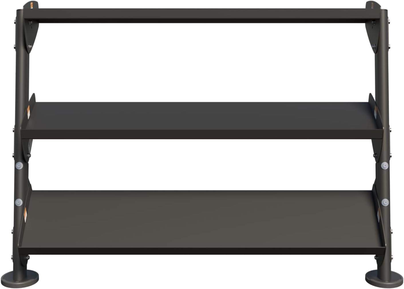 The HOIST Fitness 48" Horizontal Dumbbell Rack With Optional Third Tier allows you to keep all of your dumbbells in one compact area within your home gym. The dumbbells rack is specially designed to hold HEX dumbbells, and it is also a great rack for kettlebells, medicine balls, and more. Weight shelves may be assembled level for kettlebells or angled for dumbbells. The HOIST Fitness dumbbell rack features three angled tier levels to provide a natural lifting motion when picking up handheld weights. The matte black appearance of the dumbbell rack will look superb in your home gym. Each weight rack tier can hold 600 lbs. Dumbbell weights are not included with the home gym storage equipment, as it is a dumbbell rack stand only.