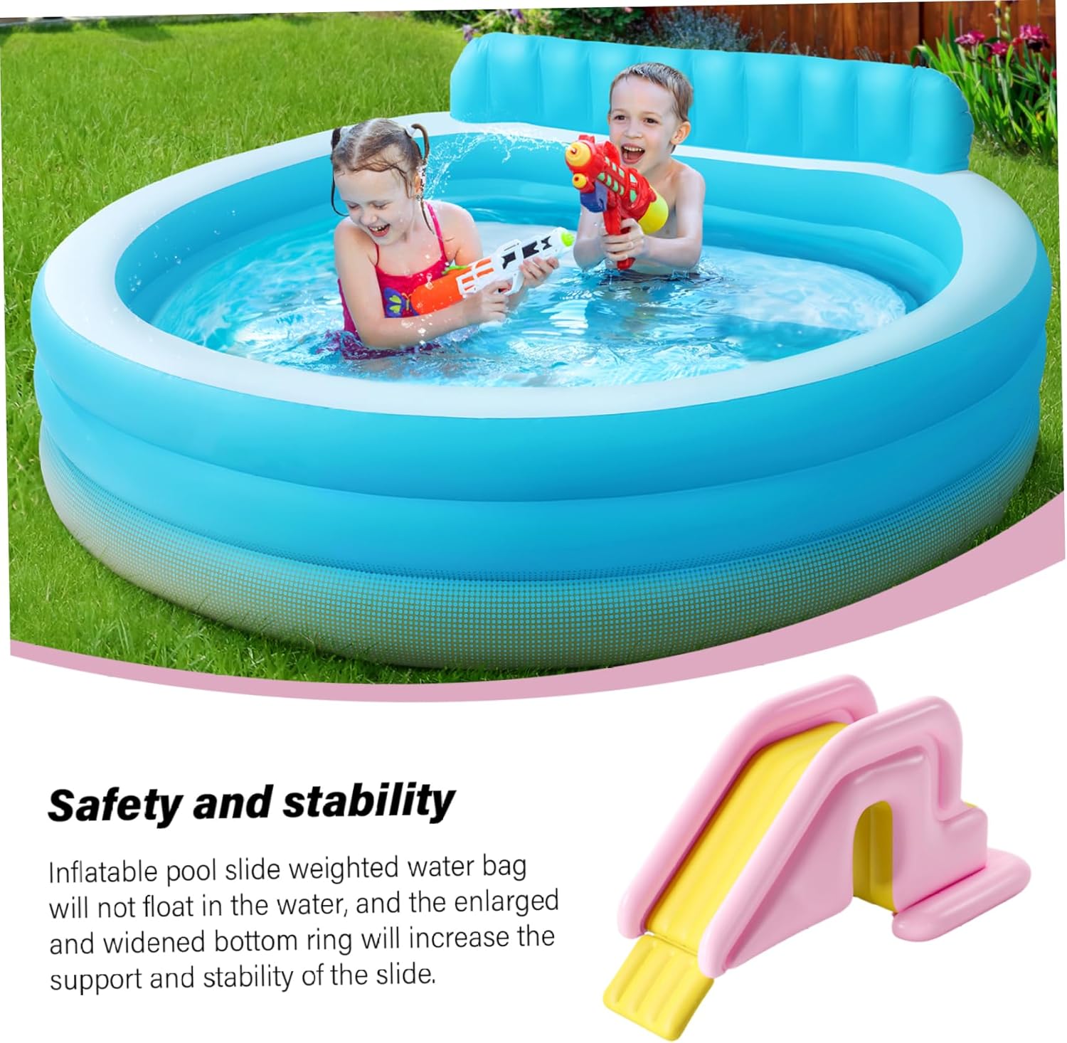 Description: The Inflatable Pool Slide is the perfect addition to your pool for endless hours of fun! Designed for both kids and adults, this water slide measures 78.7x33.5x31.5 inches, plenty of space for a thrilling slide into the water. Its stable PVC material and wide water-fillable base ensure a soft, safe, and enjoyable ride, whether you're at home, in the backyard, or indoors. This inflatable slide is easy to set up and can be used in most pools, adding excitement to pool parties, summer vacations, or daily swim time. Features:. -Material: PVC. -Size: 200x85x80 cm/78.74x33.46x31.50 inch. Slideway: 110 cm/43.31 inch. Base: 75x80 cm/29.53x31.50 inch. -Age: For Kids 6 Months +. Note:Manual measurement, please allow slight errors on size.The colors may exist slight difference due to different screens. Package Including 1 * Inflatable Pool Slide