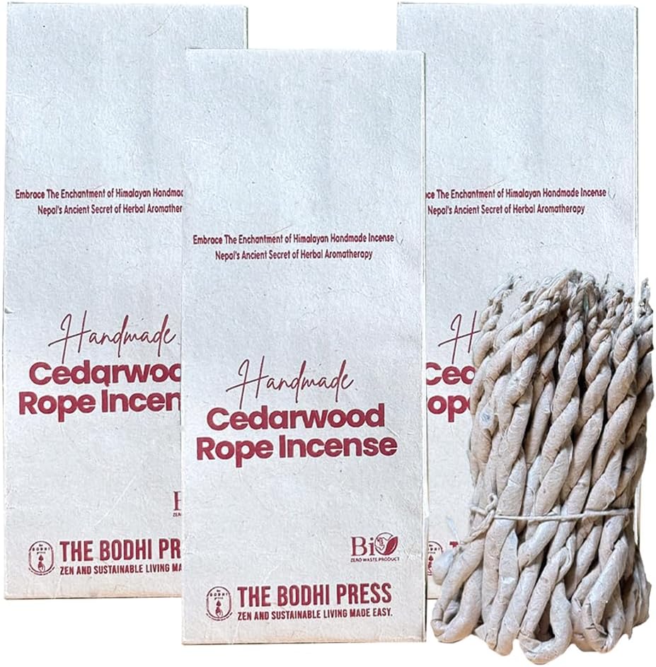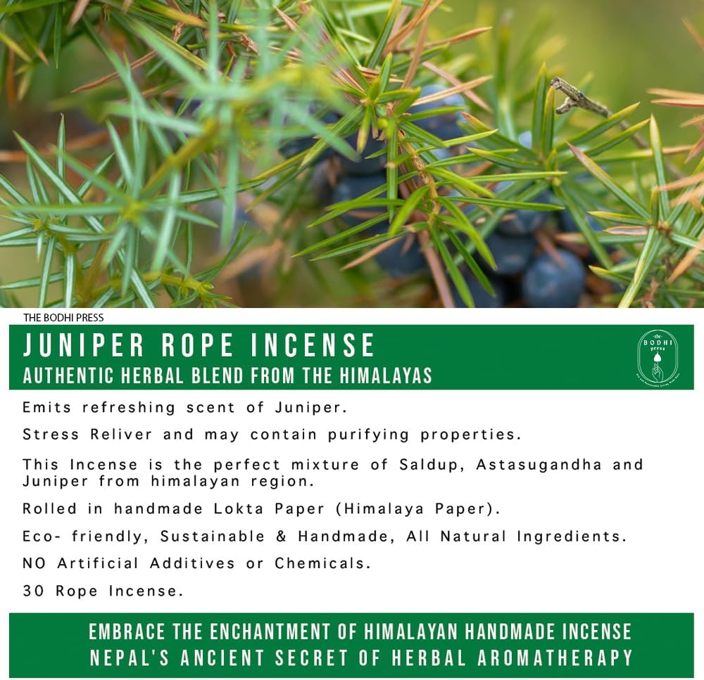 Juniper Rope Incense by Bodhi Press reflects the traditional incense-making heritage of the Himalayan region of Nepal. For generations, rope incense has been prepared using aromatic herbs and natural plant materials gathered from the Himalayan mountains and traditionally used in temples and spiritual spaces. This distinctive incense style is created by carefully wrapping finely ground herbal blends in handmade Lokta paper, forming a rope-like structure. When lit, the rope slowly smolders and releases a warm, earthy fragrance that creates a calm and peaceful environment. Juniper prayer rope incense is often used during meditation, yoga sessions, prayer rituals, and moments of quiet reflection. The gentle aroma helps set a mindful atmosphere, making it a wonderful addition to meditation rooms, yoga studios, or personal relaxation spaces. Each individual bundle contains 30 handcrafted rope incense pieces, offering a convenient option for daily rituals or occasional spiritual practices. With its natural herbal composition and traditional preparation method, this Himalayan rope incense provides a unique aromatic experience inspired by centuries-old practices. Whether you are beginning a meditation routine or simply enjoying the soothing fragrance of natural incense, Juniper Rope Incense offers a traditional and authentic Himalayan aroma for your home.