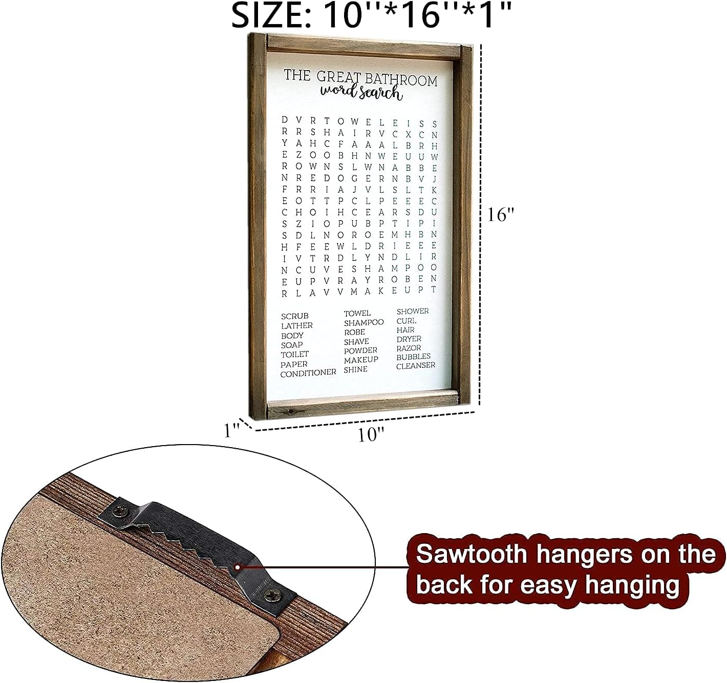 💌TO MY DEAR CUSTOMERS: Good News! The spelling error on " SHAMPOO" has been fixed! Click the "Add to Cart" and get the correct word search sign today! Thank you for your trust!!😘😘😘2021/8/23Have you ever been to the bathroom and forgot your phone? Well with this sign you can now have the entertainment to pass the time. No more reading those pesky shampoo bottles!! Get yours today and entertains everyone who uses the bathroom! This charming framed sign is the perfect addition to your modern farmhouse decor! ✔ Product Details: ✅Size: 10x16 Inch ✅Color: Available in 2 colors(Black&White) for your choice! ✅Lettering is permanently printed onto the sign ✅Frame is made with new pine wood, finished with beautiful dark-walnut stain ✅ hanger hardware attached for easy hanging ✅The perfect unique gift for every person and occasion! ✔NOTE: Each piece of wood is hand-selected for its unique grain, knots, and “natural imperfections” which add to the beauty, charm, and character of each piece. Every sign is hand cut and hand sanded in our family owned factory.✔☎️OUR SINCERE SERVICE:24 hours seller support at your service, if you are not completely satisfied, you will get a prompt refund or replacement, no questions asked!!!
