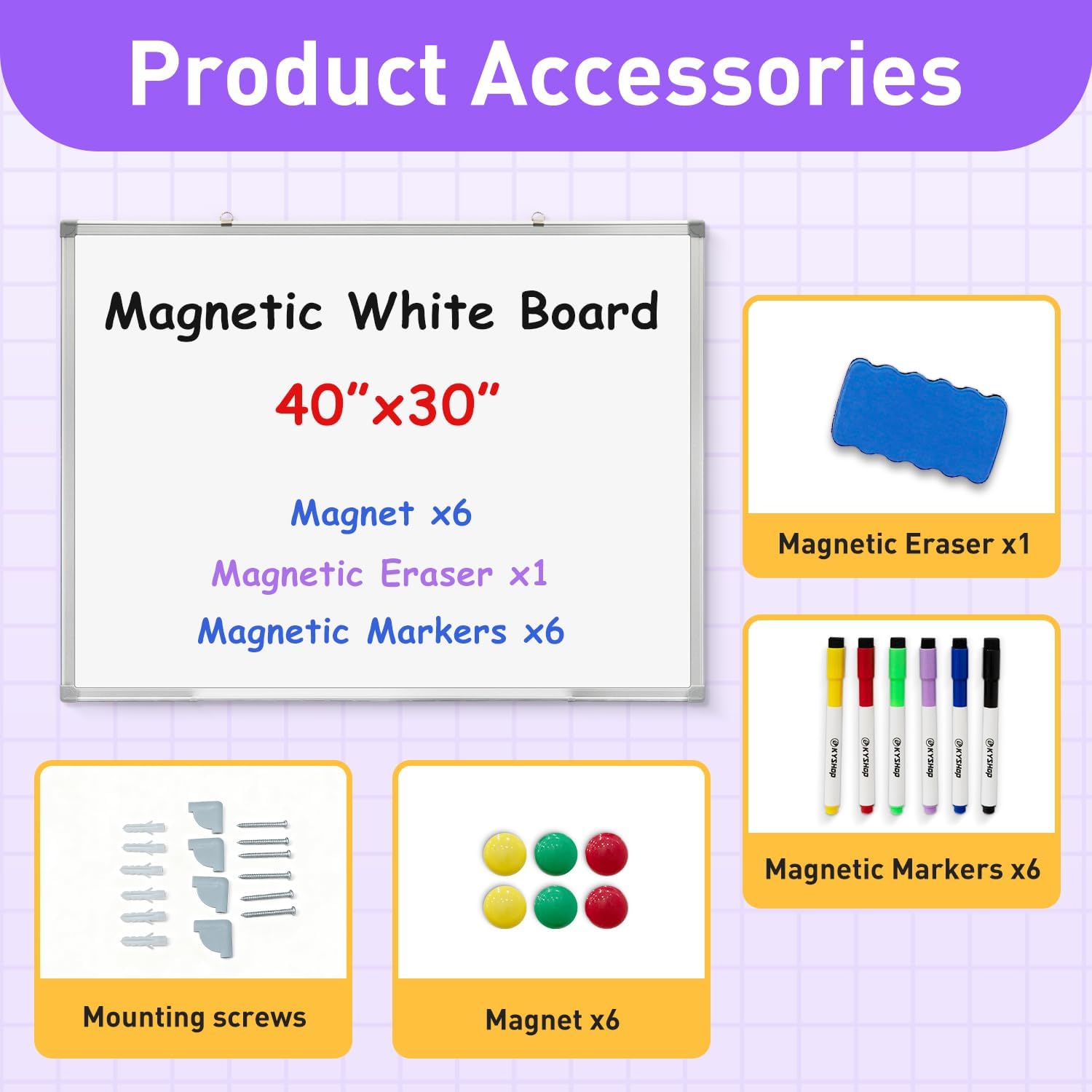 Upgrade your workspace with KYSHop professional-grade magnetic whiteboard. Package includes: 1x 40*30" whiteboard with pre-attached tray 6x magnetic dry erase markers (black/blue/red/green/yellow/purple) 1x microfiber magnetic EVA eraser hanging hooks/mounting screws with expansion anchors