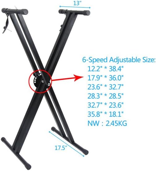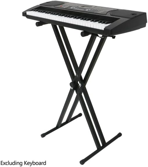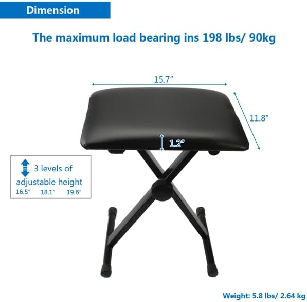 Product DescriptionMaximize your musical setup with this versatile Dual-tube X-Shape Keyboard Stand and Bench Set. The stand features six adjustable height positions from 18.1" to 38.4" and six width adjustments from 12.2" to 35.8", supporting up to 110.23 lbs. The matching bench adjusts from 18" to 20" in height and holds 198.42 lbs. Made from durable iron with a foldable design for easy transport, this professional set is ideal for keyboards, synthesizers, or DJ equipment.Key Features & SpecificationsFully Adjustable Keyboard Stand: Six height settings (18.1" - 38.4") and six width settings (12.2" - 35.8") for custom instrument positioning.High Weight Capacity: Stand supports 110.23 lbs; bench holds 198.42 lbs.Compact & Portable: Stand folds to 2.4" thick; bench folds to 3.94" thick for easy storage and transport.Durable Iron Construction: All-black iron frame ensures stability and longevity during performances or practice.Complete Professional Set: Includes 1 adjustable keyboard stand and 1 adjustable bench.Technical SpecificationsStand Height Range: 18.1" - 38.4"Stand Width Range: 12.2" - 35.8"Stand Folded Dimensions: 17.3" L x 39.4" W x 2.4" HBench Height Range: 18" - 20"Bench Folded Dimensions: 25.19" L x 11.81" W x 3.94" HMaterials: Iron, Foam PaddingColor: BlackPackaging List1 x Dual-tube X-Shape Keyboard Stand1 x Adjustable Height Bench1 x Set of Assembly Hardware (if applicable)1 x Instruction Manual