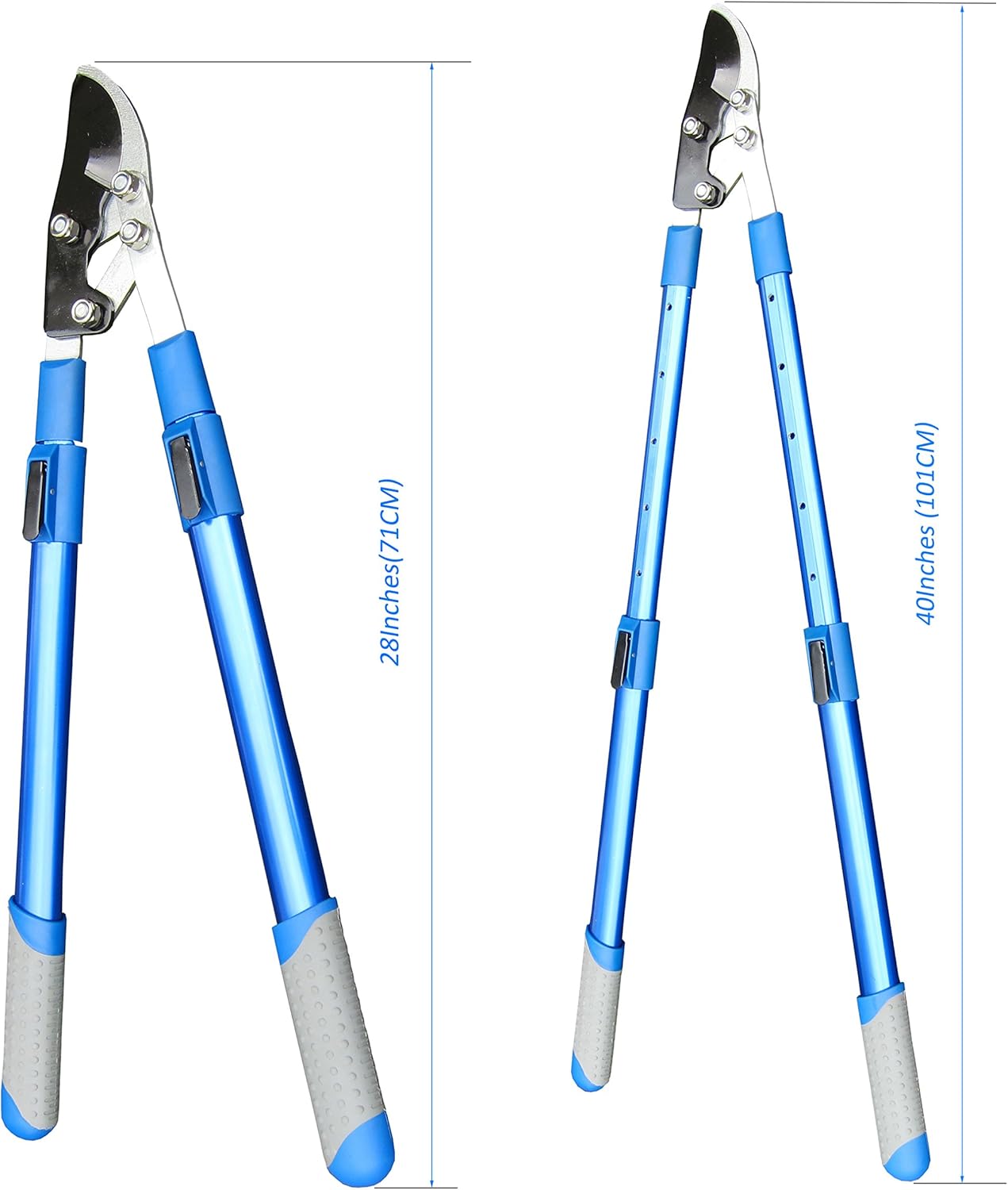 PROFESSIONAL GARDENERS LEVERAGE LOPPER: Ideal for chopping hard-to-reach thick branches, cutting capacity upto 1.8"(45mm) thick branchesSTAINLESS: Using good performance 46Cr13# stainless steel cutting blade, with heat treated HRC48-52ALUMINIUM HANDLE: Aluminium telescopic handle blue anodized surface finishing, with soft dual-color vinyl grip for adding comfortEASY BRANCH-CHOPPING and COMFORT: Compound action mechanism makes cutting super easy through extra leverage. Big range of telescopic [28Inches(71CM) to 40Inches (101CM)] adjustable make the lopper your specialized sizes and makes the job relaxedIdeal for garden maintenance