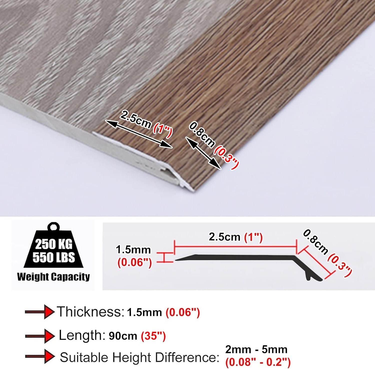 Our carpet floor transition strip can bring convenience for you and your family, at the same time, it can flexibly adapt to the different decoration styles, perfectly into any space!Package Contents: 1 x Threshold Transition Strip(Including: Self-adhesive Tape)Specification:- Material: Aluminum Alloy- Length: 90cm/35inch- Thickness: 1.5mm/0.06inch- Suitable Height Difference: 2mm(0.1") - 5mm(0.2").- Load: 250kg/550lbs.- Can be Customized: YesFeature:- Strong aluminum construction can long-term use.- It can create a smooth transition between different flooring surfaces.- Quick & easy installation and can free cut to the length you require- Easy to clean and maintain, It perfect for everyday use.- Carpet trim can cover seam and protects carpets or flooring edges.- The Threshold Strip can prevent you trips over or falls.Please Note:- Due to the light and screen difference, the item's color may be slightly different from the pictures.- There may be slightly deviation in dimensions due to manual measurement. Thank you for your understanding.Efficient Customer Service:- In the process of receiving or using the product, if you encounter any problems, please feel free to contact us. We value your comments and offer nice solution for you.- If you need more styles, please search for our product " floor carpet transition strip" to get more other styles.