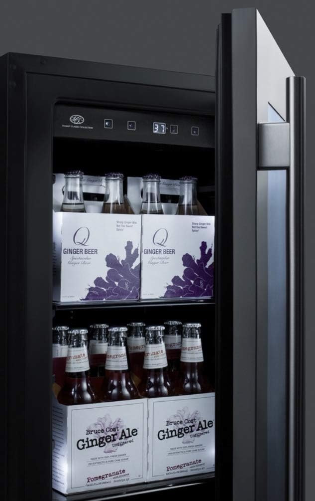 Summit Appliance CL181WBVCSS 18" Wide Built-in Beverage Center with Seamless Stainless Steel Trimmed Glass Door and Stainless Steel Wrapped Cabinet, Digital Thermostat, Automatic Defrost The CL181WBVCSS is an 18" wide beverage center. The seamless stainless steel door trim blends right into the softly tinted double pane tempered glass, with a professional stainless steel handle and designer kickplate completing the stunning look. Key Features - Flexible design allows built-in or freestanding use - Seamless stainless steel trim on glass door brings elevated style under the counter - Slim 18" width is perfect for home bars - White LED lighting presents an elegant look for the interior - Adjustable glass shelves ensure spill-proof storage - Digital thermostat offers precise and convenient temperature control Specifications - Height of Cabinet: 34" - Width: 17.63" - Depth: 23.5" - Depth with Handle: 25.38" - Depth with door at 90°: 39.63" - Capacity: 2.9 cu.ft. - Bottles: 34 bottles - Defrost Type: Automatic - Door: Glass - US Electrical Safety: ETL - Canadian Electrical Safety: ETL-C - Sanitation: ETL-S - Amps: 1 - Voltage/Frequency: 115V AC/60Hz - Sabbath Mode: Yes - Door Swing: RHD - Reversible: Yes - Shelf Type: Glass - Shelf Qty: 3 - Adjustable Shelves: Yes - Thermostat Type: Digital - Fan Type: Interior and Exterior - Refrigerant Type: R600a - Refrigerant Amount: 0.85oz - High Side PSI: 270 - Low Side PSI: 105 - Interior Light: Yes - Temperature Range: 36 to 43ºF - Interior: 23"x12.25"x17.5" - Compressor Step: 3.25"x12.25"x5.25" - Weight: 90 lbs - Shipping Weight: 93 lbs