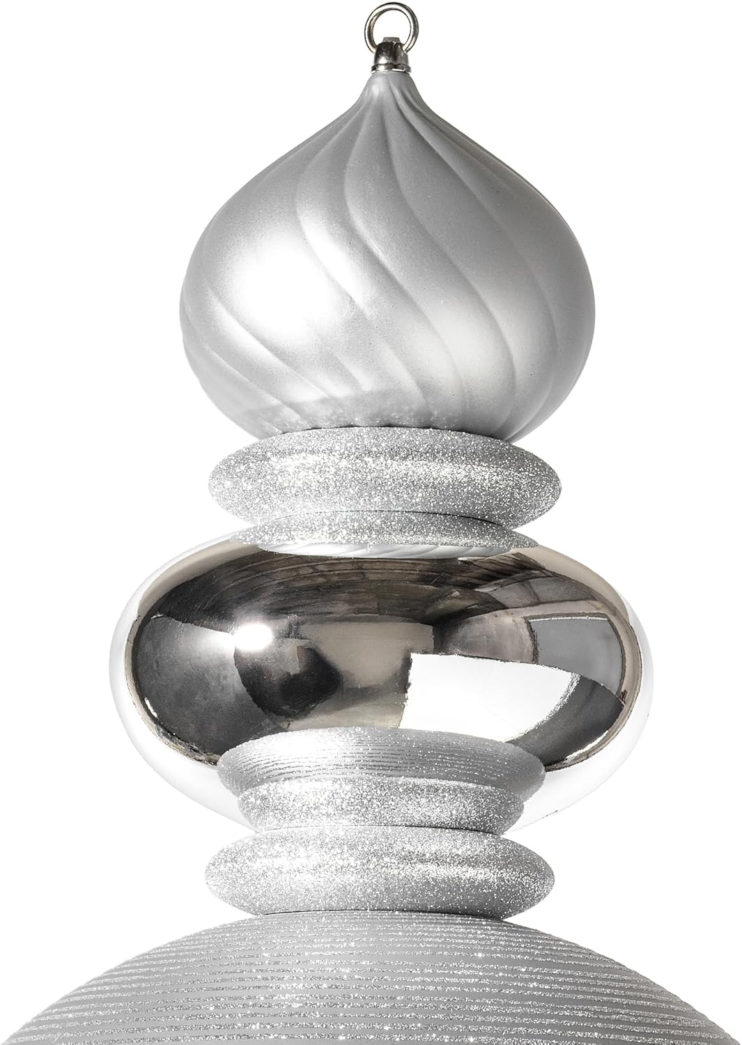 Vickerman 62" Silver Finial Ornament with Shiny, Matte, and Glitter Finishes. This ornament is made from shatterproof plastic and features a secure cap to ensure it is reliable and durable. Shatterproof ornaments are kid and pet friendly and safe for the entire family to help hang on the tree. Drilled & Looped - Hang your ornaments with peace of mind using our drilled and looped features. With drilled and looped ornaments, the cap is decorative and the ornament itself is secured to the tree with floral wire ensuring your ornaments will stay in place for as long as your tree is up. This unique ornament is an exceptional addition to any collection as it matches well with a variety of décor and goes perfectly on a holiday tree. Vickerman has been an industry leader since 1940. Enjoy this expert designed ornament in your home.
