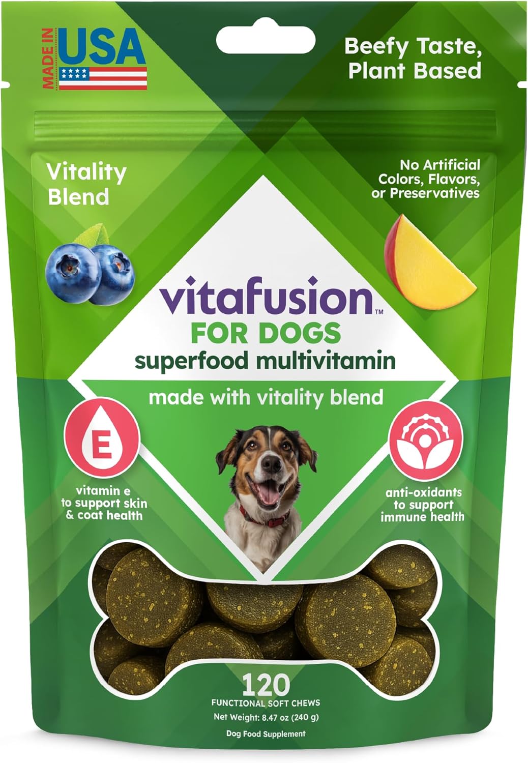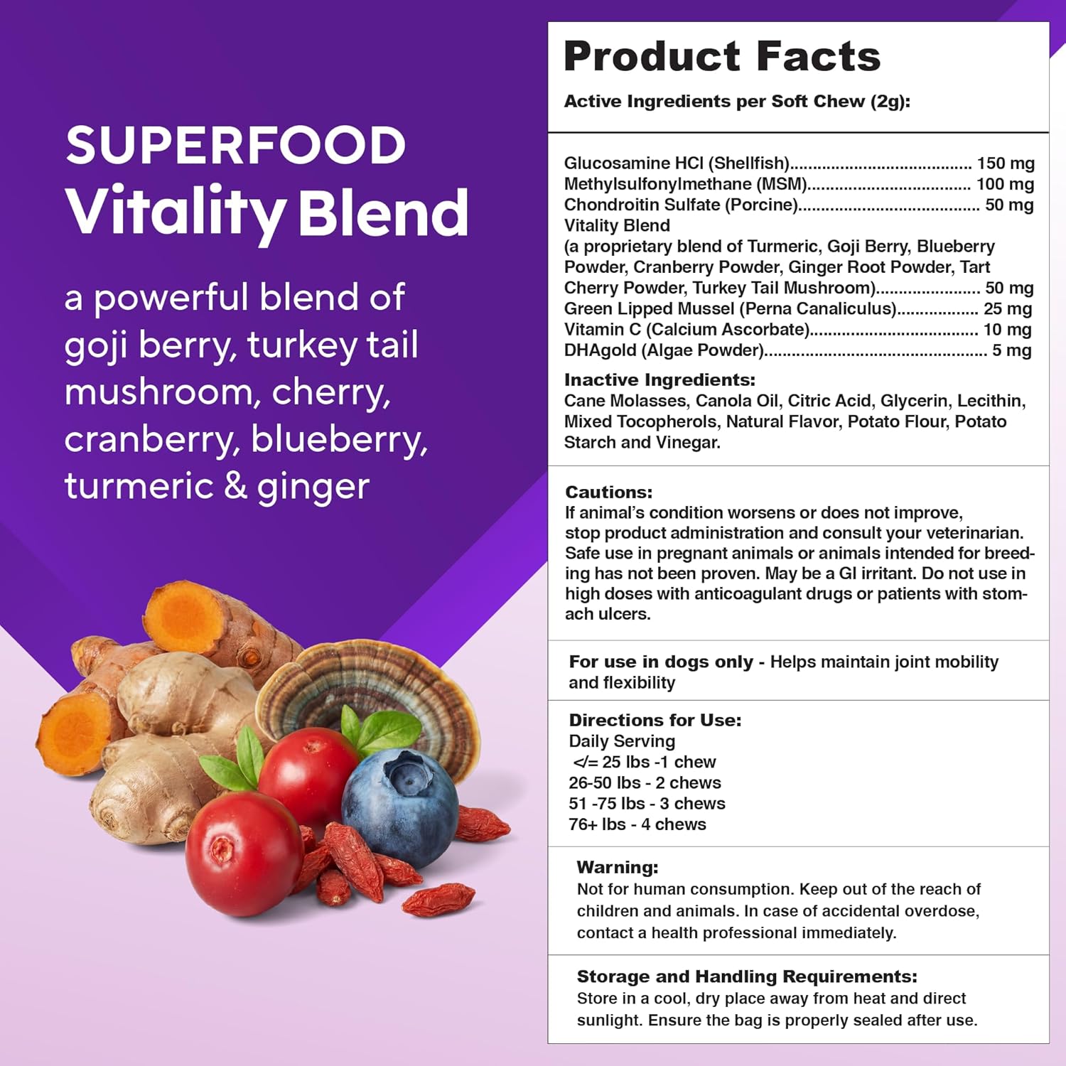 | Active Ingredients | Ingredients (per soft chew – 2g) Glucosamine HCl (150 mg), MSM (100 mg), Chondroitin Sulfate (50 mg), Green Lipped Mussel (25 mg), Vitamin C (10 mg), DHA (Omega-3) (5 mg), Vitality Blend (50 mg) ( Turmeric - Goji Berry - Blueberry Powder - Cranberry Powder - Ginger Root Powder - Tart Cherry Powder - Turkey Tail Mushroom) |