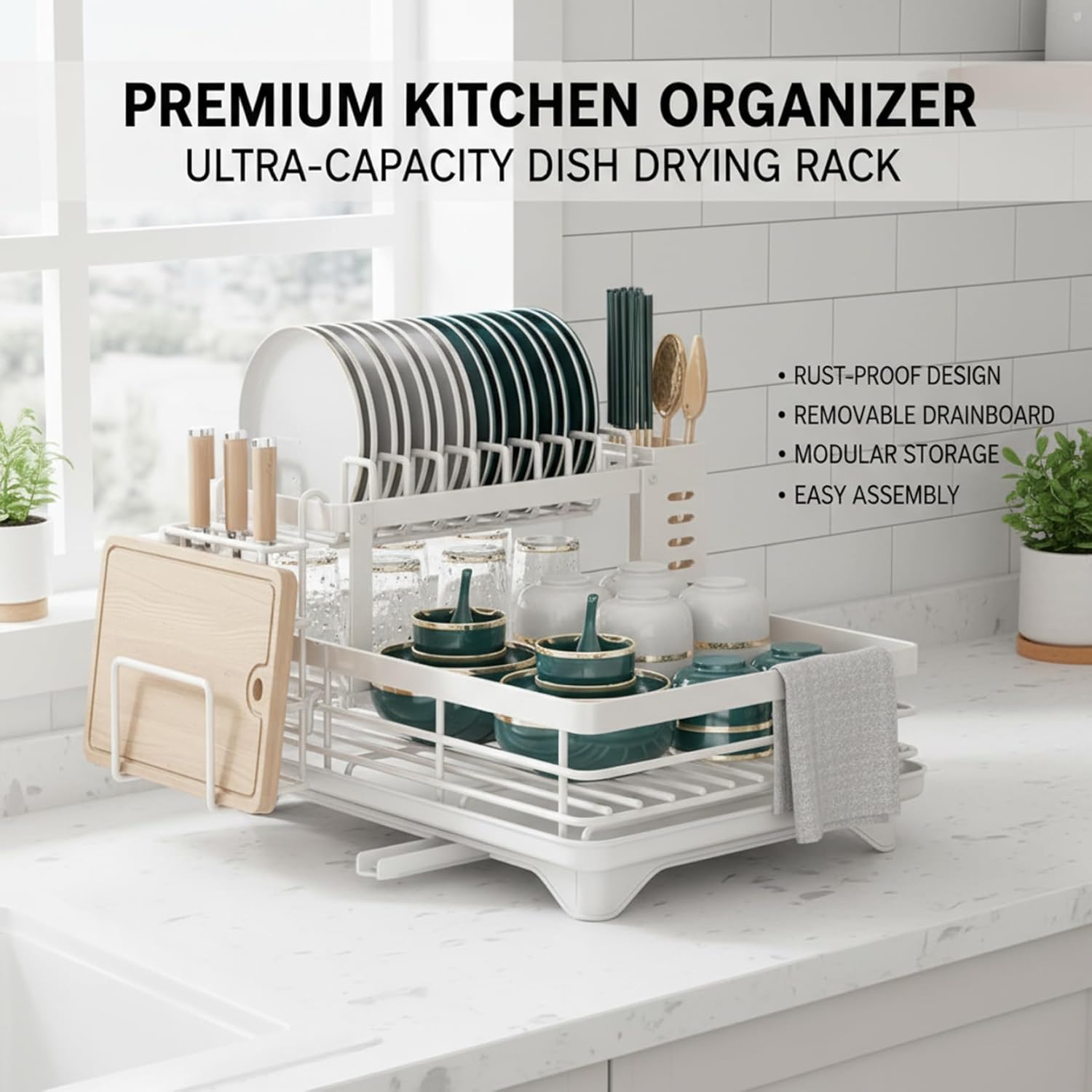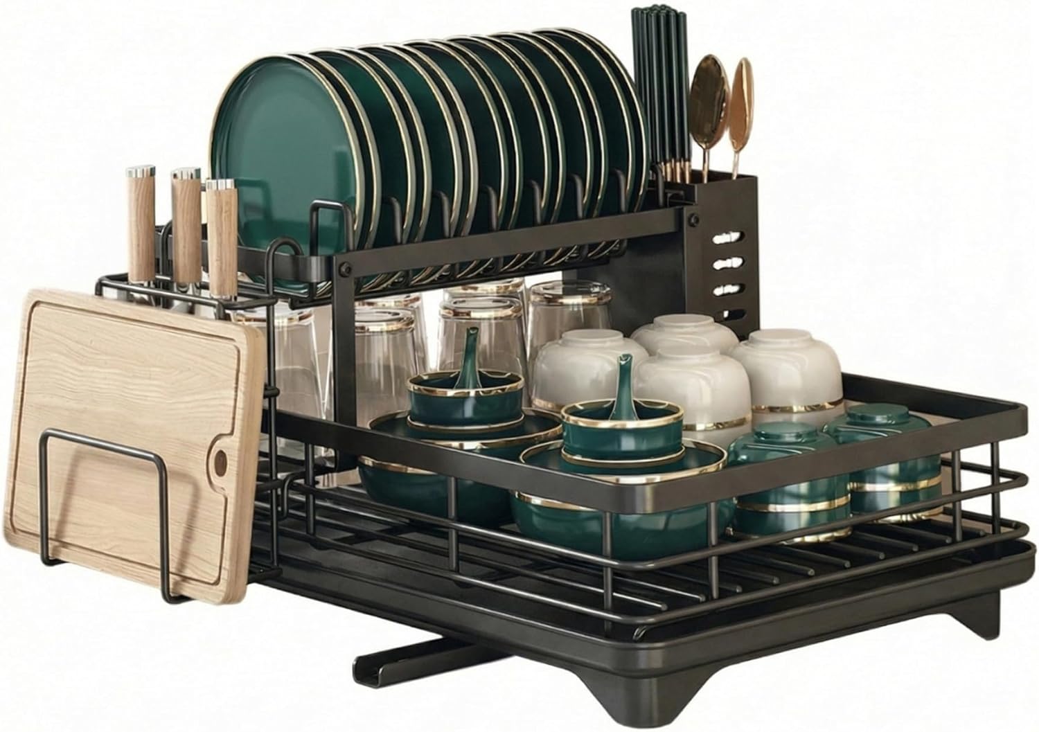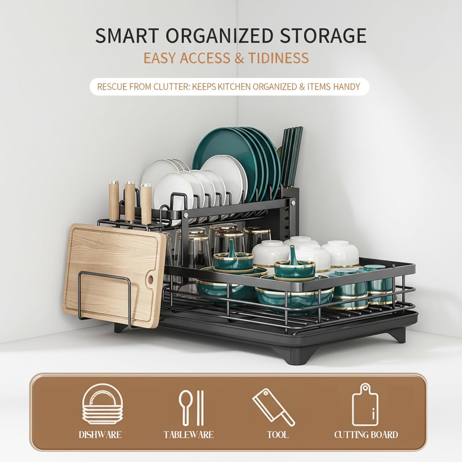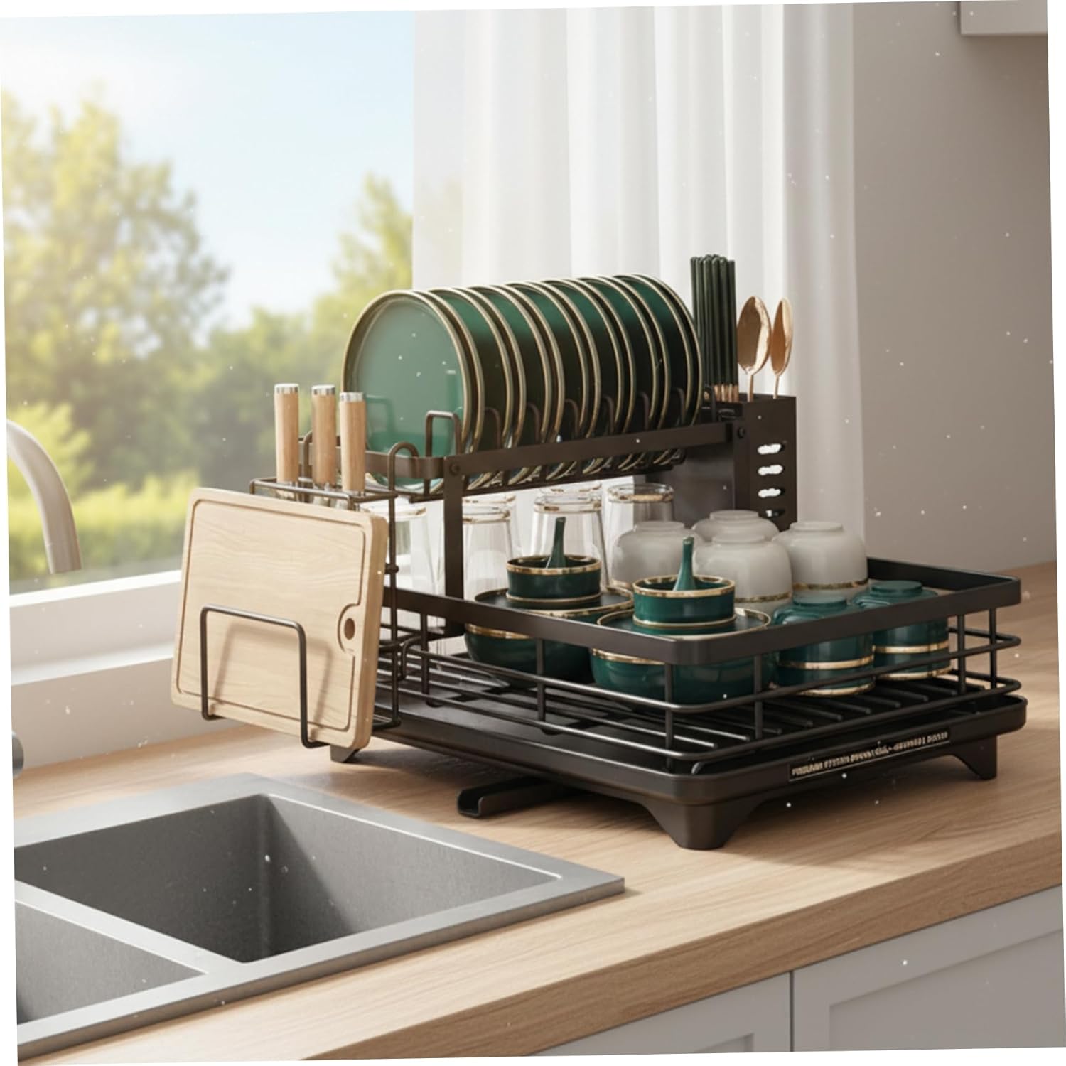 Description: This Dish Drying Rack 2 Tier by [Brand] is the ultimate kitchen organizer designed to simplify dish drying with a stylish and functional approach. Crafted from stable powder-coated carbon steel, it ensures long-lasting rust-resistant performance, perfect for daily use. The rack's innovative 3-in-1 multifunctional design includes an upper tier dedicated to plates, a spacious lower tier for bowls and cookware, and a detachable utensil holder that accommodates knives, chopsticks, and cutting boards, helping to maximize your countertop while maintaining cleanliness. Its self-draining board features a central drain hole paired with a 360° rotating spout, efficiently channeling water directly into the sink to avoid puddles and water damage on surfaces. Installation is tool-free and fast, allowing effortless assembly within minutes, making it ideal for busy lifestyles. Whether you're drying large plates, cups, or kitchen tools, this large dish drying rack adapts perfectly to your kitchen needs, improving organization and hygiene. The thoughtful compartment zones promote improved airflow for faster drying times, ensuring your dishes come out spotless every time. Enhance your kitchen with this multifunctional, high-capacity dish drainer that combines durability, convenience, and elegant design, turning dish cleanup into a stress-free task while elevating your kitchen's functionality. Features:. -Color: Black. -Material: Carbon Steel. -Size: 42.5x30x23.5 cm/16.7x11.8x9.3 inch. Note:Manual measurement, please allow slight errors on size.The colors may exist slight difference due to different screens. Package Including 1 * Dish Drying Rack