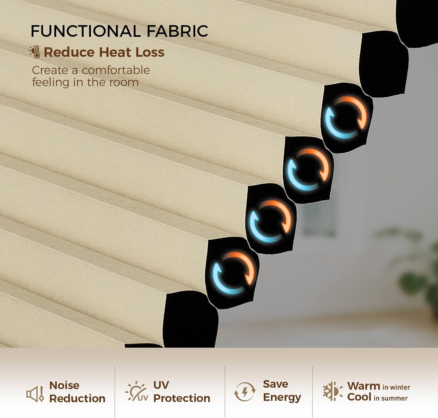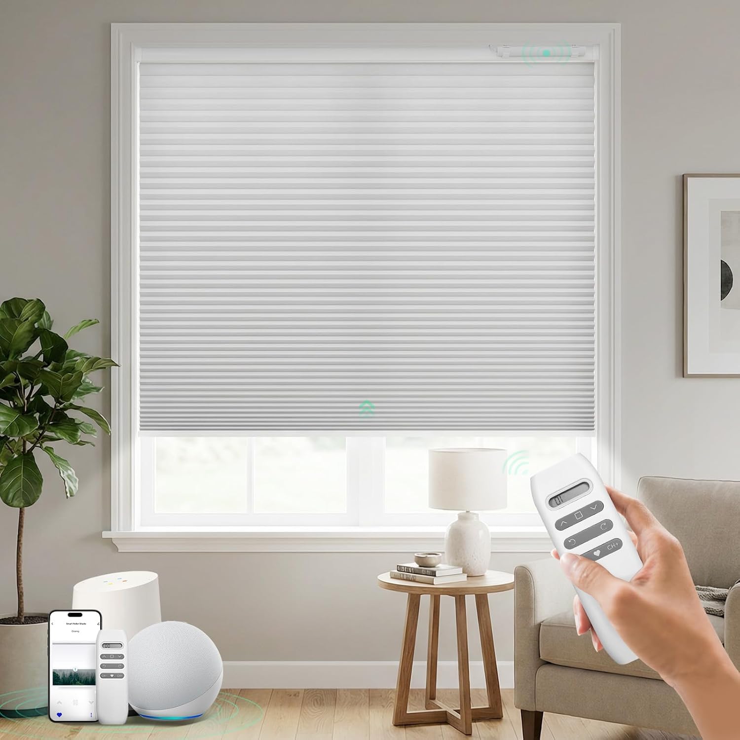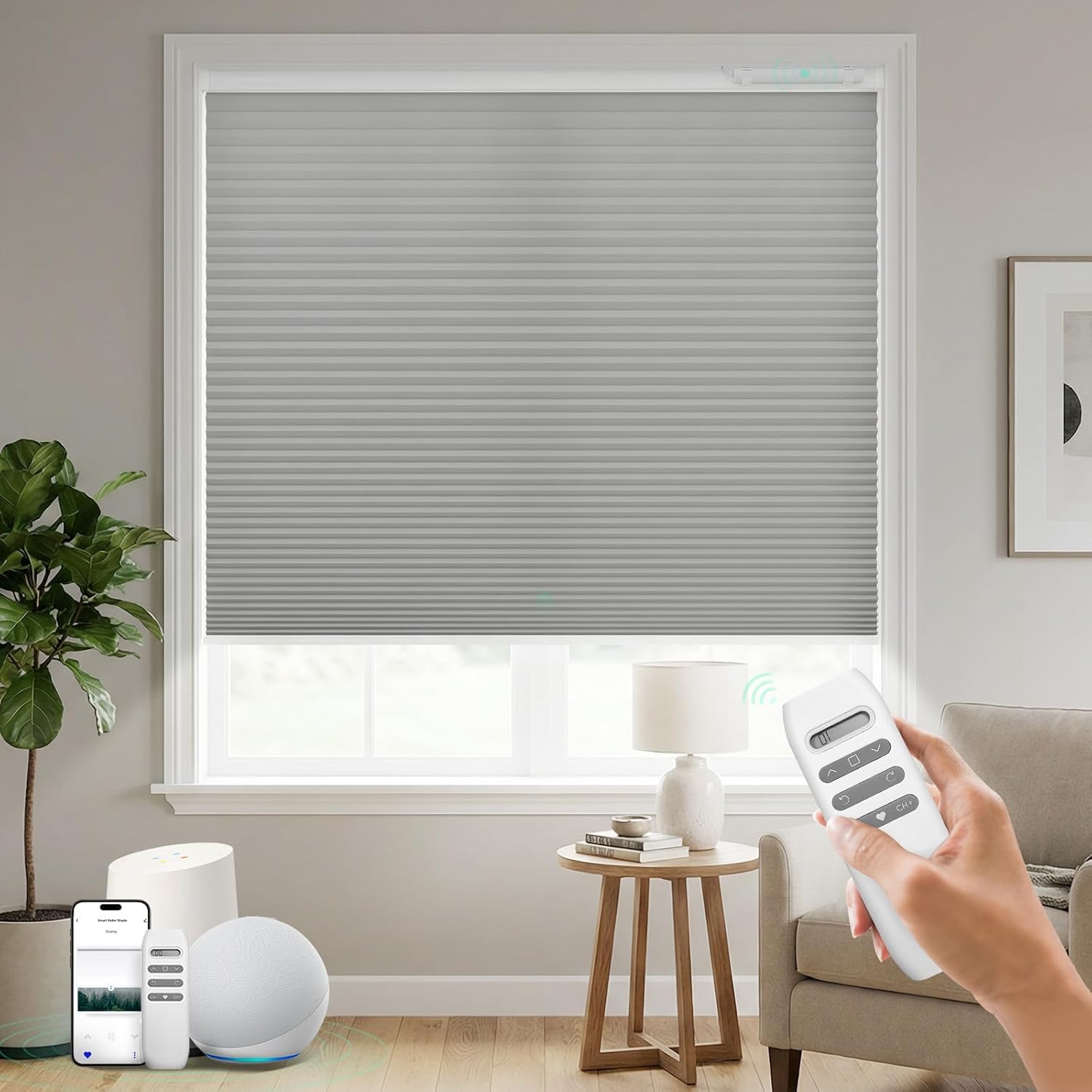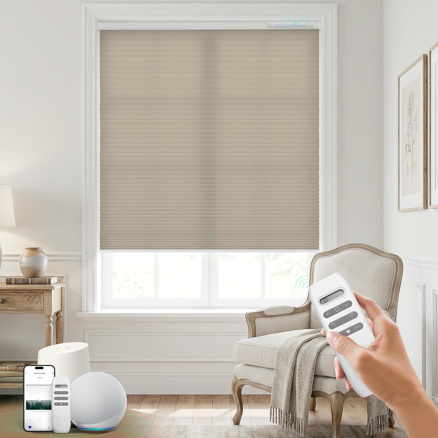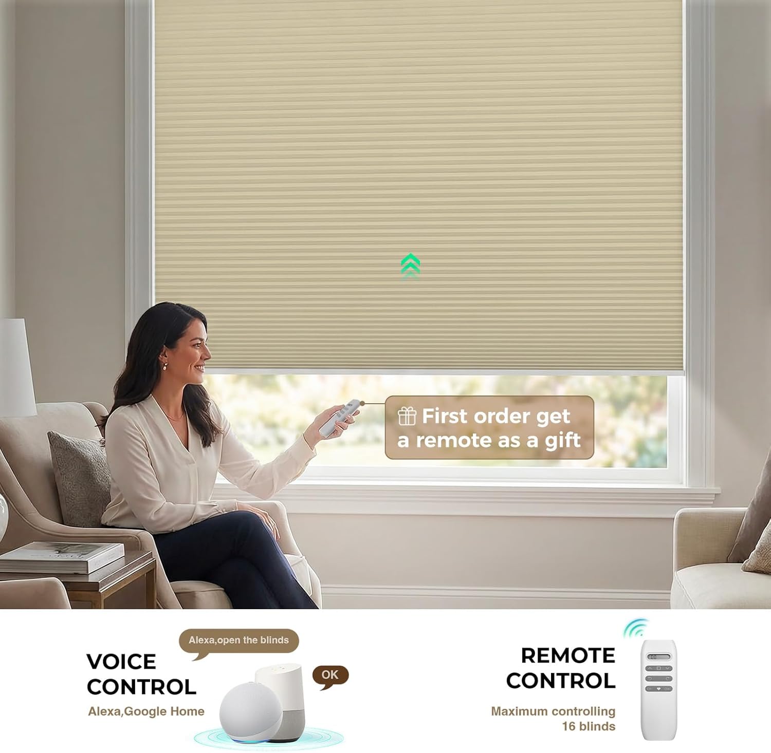HeyBlinds Motorized Cellular Shades with Remote Control, Rechargeable Smart Honeycomb Blinds for Indoor Windows, Blackout Automatic Shades Compatible with Alexa/Google, Custom Size (Pure Calm - Stone Beige BO)